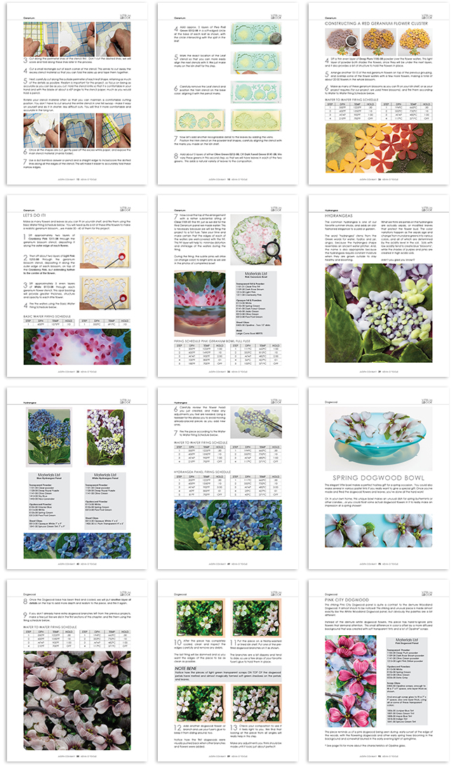 Botanic Topics Book 2: Plant Portraits in Glass contains over 106 pages of clear and comprehensive step-by-step instructions, complete with materials lists, over 190 color photos and illustrations, all necessary firing schedules in Fahrenheit and Celsius, as well as a complete library of stencil patterns.