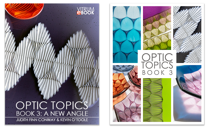 Optic Topics, Book 3 delves into a whole new angle of a much-loved technique. Our latest eBook takes inspiration from Art Nouveau, with patterns that recall falling leaves, intricate fans, and delicate scales. Optic Topics, Book 3: A New Angle, will lead you through 6 chapters, each with multiple palette projects and new, simple methods to add just a hint of Optic pattern to any kiln formed project. Subtle but easy color fades further expand the palette.