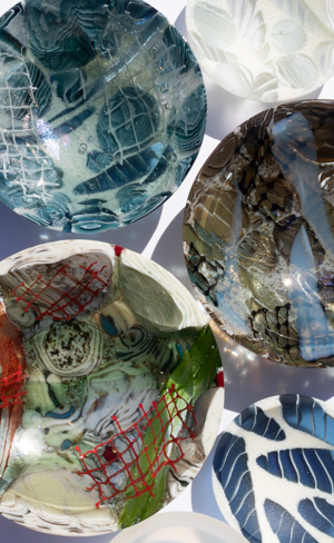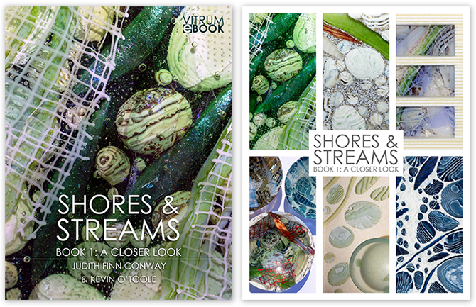 This, the first book in a new Vitrum Studio eBook series, examines in close detail the environments of everyday streams and waterways.   We illustrate and explain methods for creating the pebbles, seaweeds, shells and scraps of netting and the waters they inhabit using just sheet glass, frits, and powders. We then delve into increasingly complex ways of incorporating these elements into unique glass compositions that embody the essence of shorelines and streambeds. Some pieces revel in the beauty of what’s left behind when the tide recedes while others plum the watery depths in a complex multilayered block.
